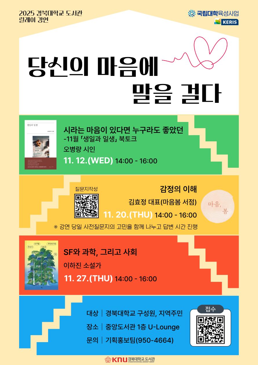 Notice b 릴레이 강연 「당신의 마음에 말을 걸다」 안내 Writer 경북대학교 도서관 views 2998 No file 조용한 계절, 도서관이 세 사람의 목소리로 당신의 마음에 다가갑니다.시인의 언어, 심리상담가의 위로, SF 작가의 상상이 함께하는 세 번의 특별한 만남이 도서관에서 펼쳐집니다.시, 상상, 그리고 마음의 이야기가 스며드는 시간 —11월, 도서관에서 당신의 마음이 머무는 자리를 만나보세요. ● 신청하러 가기 - 교내 구성원(바로가기) - 지역주민(바로가기)● 문의: 도서관 기획홍보팀(☎053-950-4664) list