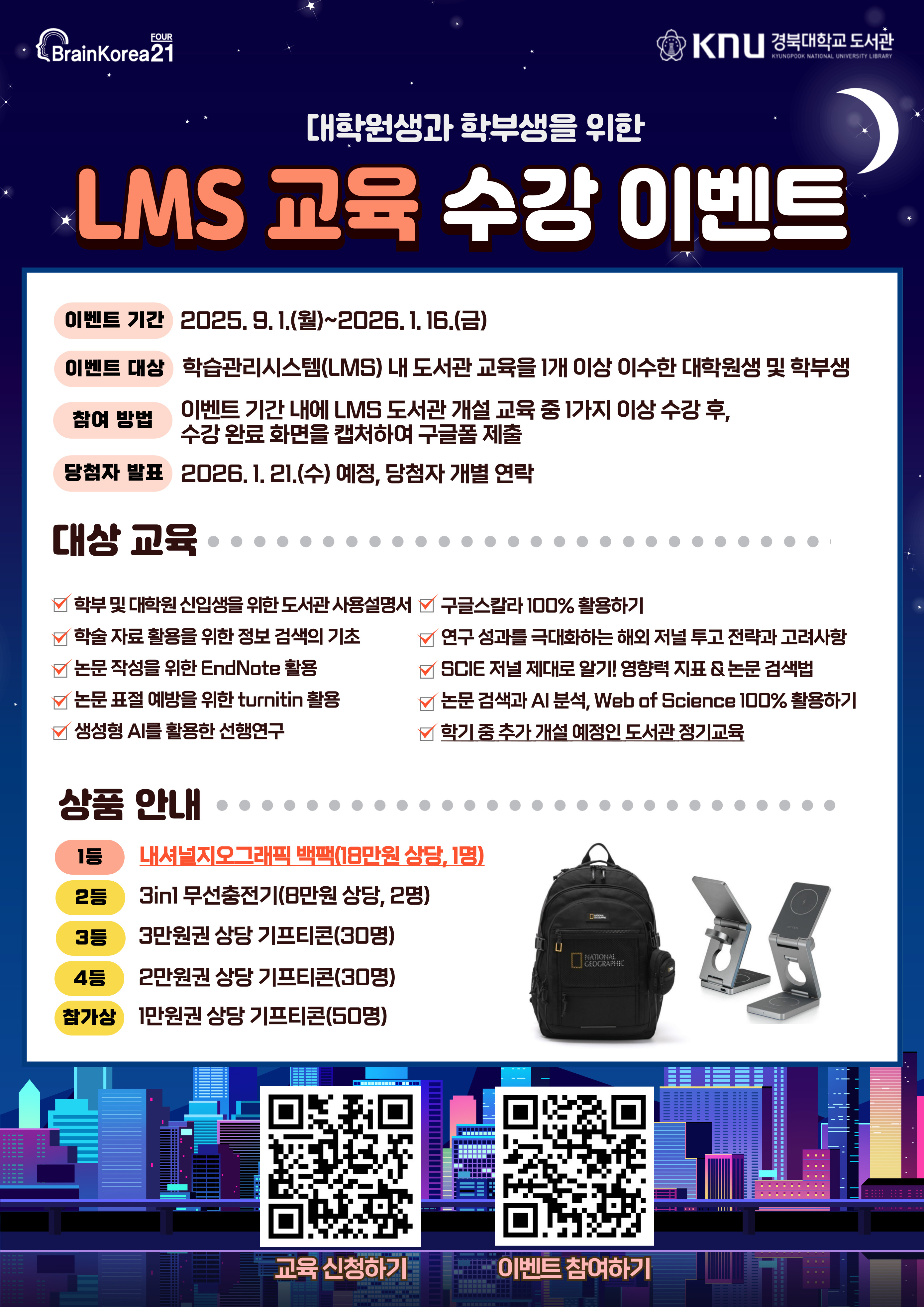 도서관에서는 2025학년도 2학기 도서관 학습관리시스템(LMS) 교육 수강 이벤트를 다음과 같이 시행합니다.